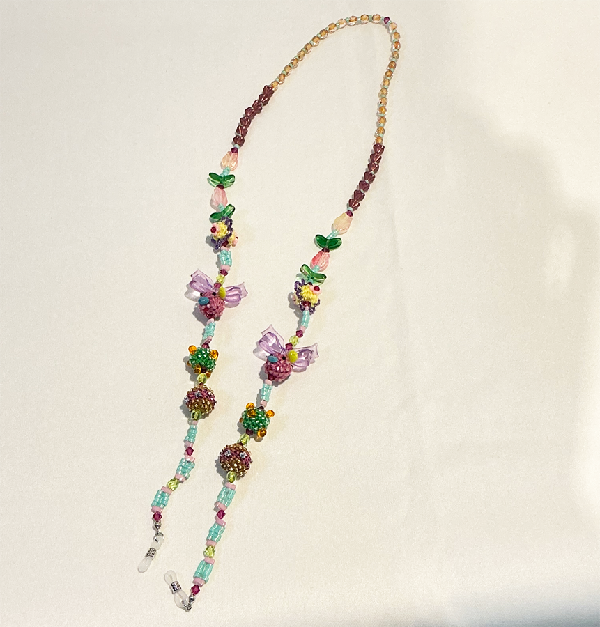 カラフルなビーズが連なり、お花とリボンブタのモチーフに、カラフルあみ玉が清涼感をプラスしているメガネホルダー。シリコン部分に眼鏡のツルを通してお使いください。